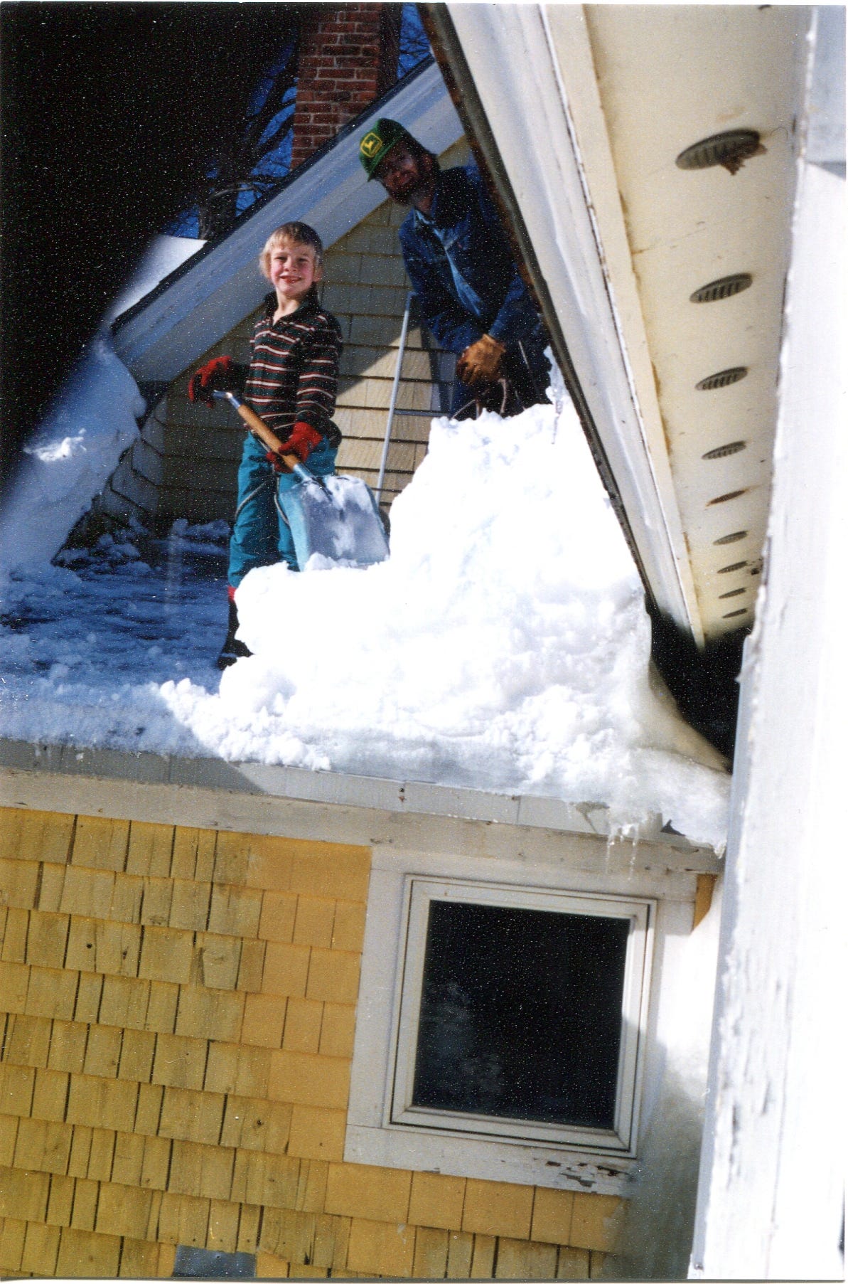 Other memories of his childhood snow adventures are more fun than that one. When he was really little he loved to go outside and just dig around in the snow, creating piles around the yard. One year, we got so much snow that we were worried about the weight of it on the roof over our laundry room. We lived in an old farmhouse in those days — one of those houses that had been added on to in the most higgledy-piddledy fashion. So, when we got concerned enough about that roof, we considered the best way to shovel it off. Seeing as the best access was through our son’s bedroom windows, we decided to haul snow shovels inside and then climb out the bedroom window to shovel.